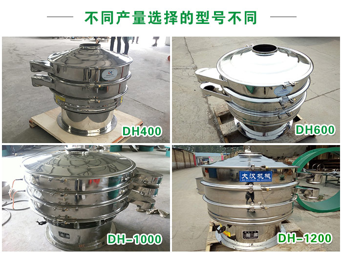 白砂糖不銹鋼振動篩型號分為DH400、DH-600、DH-800、DH-1000、DH-1200、DH-1500、DH-1800、DH-2000等8種直徑型號,根據(jù)客戶篩分白砂糖每小時不同的篩分產(chǎn)量,所選用的型號不同造成其價格是不同的,例如: