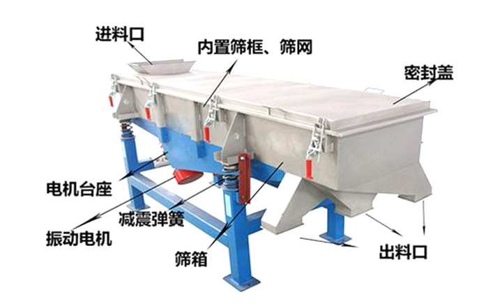 不銹鋼直線振動篩由篩箱、篩框、篩網(wǎng)、振動電機、電機臺座、減振彈簧、支架等組成。